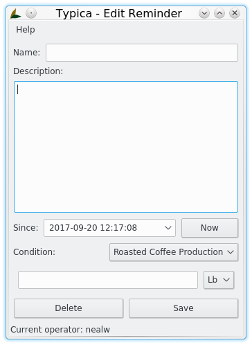 Condition specifies what should be tracked. If this is set to Roasted Coffee Production, the field below can be used to set some number of pounds or kilograms of roasted coffee produced. When that amount of coffee has been roasted, the task will come due. If the condition is set to Days, the field below changes and can be used to specify the number of elapsed days until the task will come due. Similarly, Batches Roasted and Hours of Roasting Time require a number to indicate how many batches or how many hours to use for this calculation.