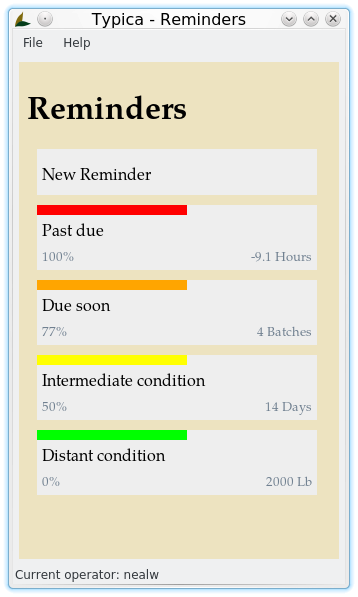 Once some reminders have been created, the items created will appear in the report. In addition to the name of the reminder, there is also a color code, the percentage toward when the task is due, and what remains on the specified condition.